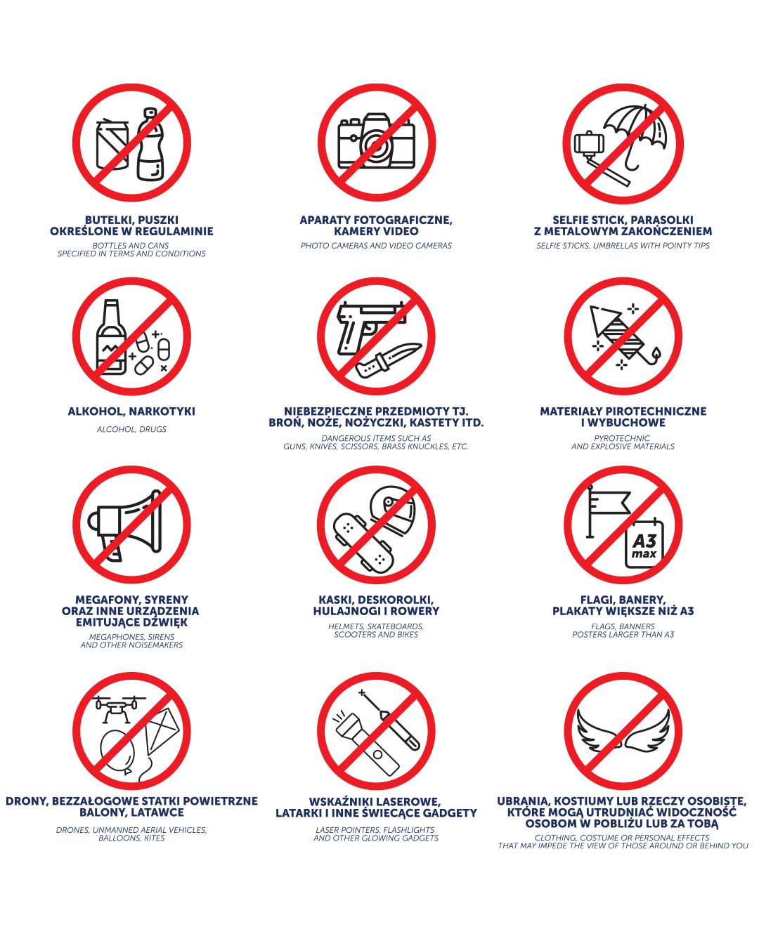 Organizator zakazuje wnoszenia i posiadanie leków, z wyjątkiem leków w oryginalnych opakowaniach, dostępnych bez recepty oraz których posiadanie potwierdzone jest stosownym orzeczeniem lekarskim.
